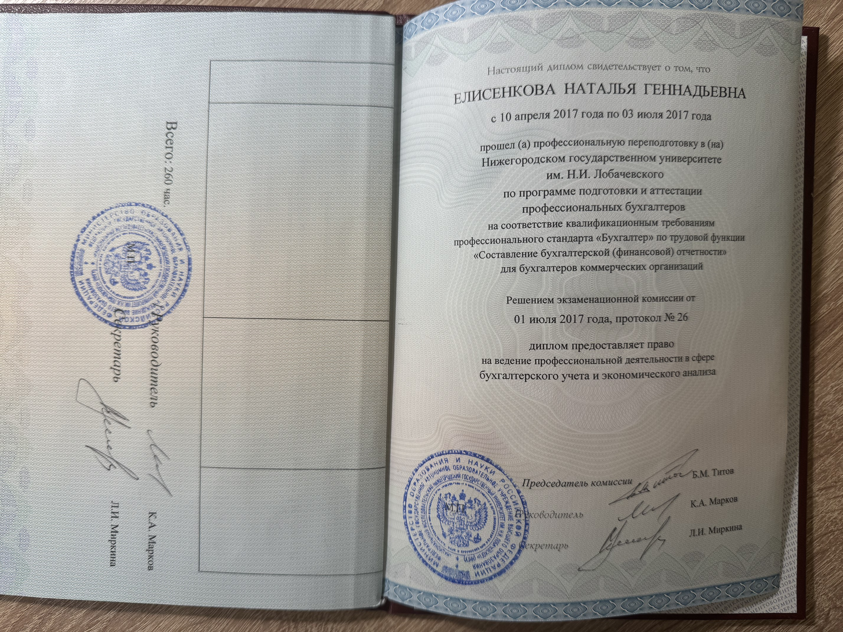 Наталья Геннадьевна Елисенкова, директор и идейный вдохновитель «ОКА-КОНСАЛТИНГ», — профессиональный бухгалтер с высшим экономическим образованием (2009 г.) и аттестатом Института профессиональных бухгалтеров и аудиторов России (2017 г.).
